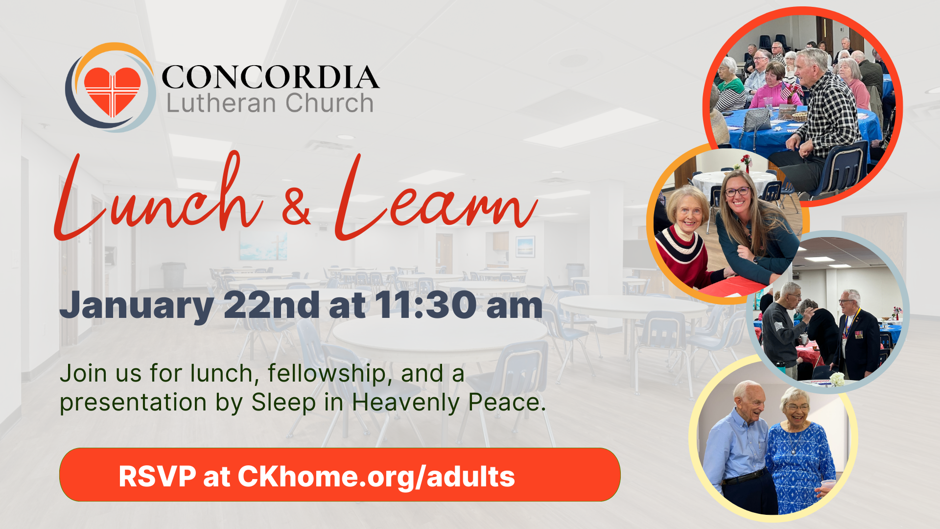 Each month, our Ageless Generations group hosts an opportunity for connection, learning, and lunch. Please join the January 22nd Lunch + Learn at 11:30 am in the Concordia Community Room.