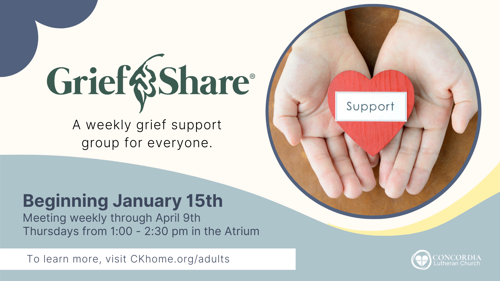 Concordia will begin hosting the next GriefShare group in the Atrium Room on Thursday, January 15th from 1:00 pm - 2:30 pm. If you know of someone grieving, please share this opportunity with them. This group is open to anyone and will meet weekly through April 9th.