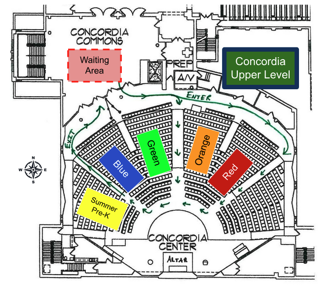 Once the doors open, please follow the traffic flow (green arrows) to find your child's Crew. The sections and pews will be clearly marked with Color and Crew Number. Your child will sit in the same pew every day. Their Crew Leader will be there ready to help you sign in your child on the clipboard and give them their name tag.